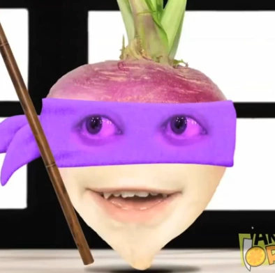 Donatello the Turnip is one of the four Teenage Mutant Ninja Turnips. He, like the rest, first appeared in "Random Cuts #02" receiving unfortunate news from a pumpkin executive that their show was going to be cancelled by AO TV. However, their first episode had aired on the Annoying Orange channel on the 17th of January in 2014, about 5 months after this news was given. The reason for this is debatable, it could have been a reboot or relaunch; the true reason is unknown. He and the other Turnips appear in "Teenage Mutant Ninja Turnips", which was their first episode. They were then seen in their dojo, overjoyed about their new superpowers. Leonardo was baffled by how they had transitioned from normal turnips to ninjas during a radioactive Slurpee spill. Donatello claimed that he would have started drinking radioactive Slurpees much prior to the accident, had he known their full capabilities. However, they were alerted by Orange that there was trouble on the surface. Michelangelo had then pointed out that they hadn't been to the surface during their lifetime. They soon emerged to the surface to find The Cheddar, along with his assistants, Peapod and Stalksteady, terrorizing the city for no apparent reason. At this point, Michelangelo began thinking of alternative catchphrases to "cowabunga", considering that Raphael persistently but constructively criticized his attempts. Donatello, completely unaware of his actions due to his eyes still adjusting to the light, had sliced right through Peapod and Stalksteady (but remained unaware). All 4 of the turnips began to surround Cheddar, thinking he was unarmed. However, he was revealed to carry a spare weapon at all times. He then started to dominate all 4 turnips, making them think he was too powerful for them. At that moment, Donatello had remember Orange's advice and removed his clothes, exposing his mortifying unicorn undergarments. The Cheddar had explained his limited laundry options, before being picked up by Dane Boedigheimer and grated into a pizza. April O'Peel then began congratulating them on rescuing the city and it's citizens. Michelangelo then began attempting to form another alternative catchphrase, frustrating the other three turnips.