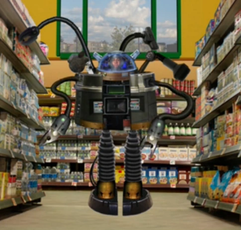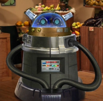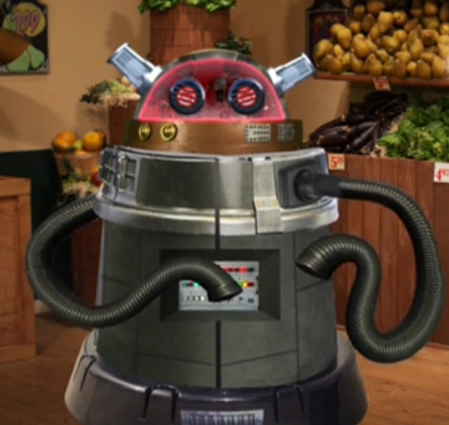 Megasuck was the main antagonist of the High Fructose Adventures of Annoying Orange episode Trans.Fruit.Bots. He is first seen after Orange and Egg were playing Mango Polo. Egg, ignoring Orange's warning, keeps moving and falls off of the fruit cart. Everyone except Pineapple begins laughing at Egg's demise. However, they quickly become worried about how Nerville will react to the mess that has been made. When Nerville sees the egg yolk on the floor, Orange and Apple nervously apologize. But Nerville tells that he is glad, because the mess gives him a chance to try his new invention. He then shows the fruits his Vacuum robot in which he named Megasuck. Megasuck cleans the mess of the floor, along with an additional pea, and Orange decides to bully the robot by spitting seeds everywhere, making Megasuck have to clean it all up. While cleaning the mess, Megasuck accidentally hits the cart, causing all the fruits (except Orange) to fall off of the cart. Megasuck then sucks up Apple, causing all the fruits to panic. Orange tries to save everyone by turning the robot off with the controller, but only fares to breaking it, causing it to fall on the floor. Megasuck then consumes the controller, causing his mainframe to be shattered. Nerville then asks the robot if he is alright, and claims that his only hope is that he can repair Megasuck in his repair room. However, Megasuck then goes crazy, and goes on a rampage throughout the store, terrorizing all of the food in the store. And since the controller is broken, Nerville can not shut Megasuck off, forcing him to have to face his own invention. Then, Megasuck finds Nerville a threat and begins to chase him around the store. When Megasuck chases Nerville to a dead end, Nerville grabs onto the fruitcart and screams as Megasuck begins to suck him up with his special vaccum. Then, Megasuck sucks off his clothes and leaves Nerville in his underwear. Then, Megasuck infuses with Nerville's body and spits out Apple. With Nerville's mind in the evil robots system, Megasuck is able to create a race of vaccum slaves. This leaves only Orange, Pear, Apple, Grapefruit, Passion fruit, Midgit apple, Pinapple, and Grapefruit left. Then, they use the Fruit cart to transform into a robot. Then, they go off into Isle 4 to battle Megasuck, who is torturing a milk quart. When they have rescued the milk, Megasuck then kidnaps Passion Fruit and uses her as a sheild, causing everyone to have to hold their fire. Then, Grandpa Lemon tells Orange a story about how back in his day, people would poison a man by what he cheirished the most. Then, they make Megasuck consume too much, overloading him. Then, he explodes, causing Nerville to fall out and slip into unconciousness. After the battle, Nerville states that he can't remember anything, and this causes him to make another Megasuck unit.
